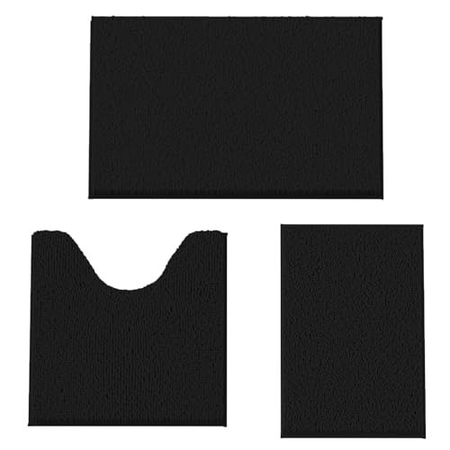 COMPOLICY PLACEROOM Bathroom Mat Set of 3, Bath and Toilet Mat Set,Ultra Soft Chenille Bath Mat Non Slip,Bath Mat Sets 3 Piece Washable,Super-Absorbent Bath(Black bath set)