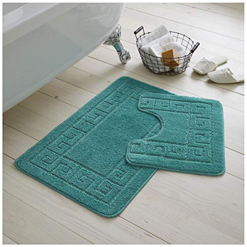 GC GAVENO CAVAILIA Greek Key Pattern Bath Mats 2 Piece Sets Non Slip, Soft Washable Rug Quick Dry Water Absorbent Bathroom Shower Mat & Pedestal Set, Teal