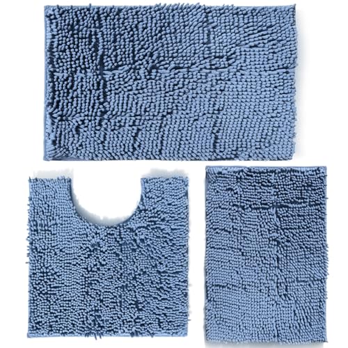 RUN HELIX Ultra Soft Chenille Bath Mat Non Slip, Bath Mat Set 3 Piece, Shaggy Bathroom Mats, Absorbent Bath Mats for Bathroom, Fluffy Bathrooms Mat Set with U-Shaped Toilet Rug (Denim Blue)