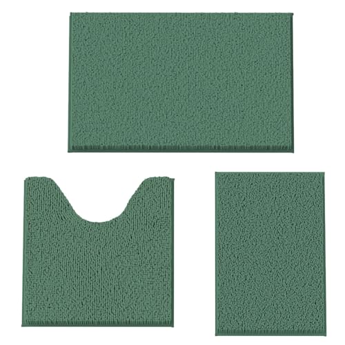 COMPOLICY PLACEROOM Bathroom Mat Set of 3, Bath and Toilet Mat Set,Ultra Soft Chenille Bath Mat Non Slip,Bath Mat Sets 3 Piece Washable,Super-Absorbent Bath(Dark Green bath set)