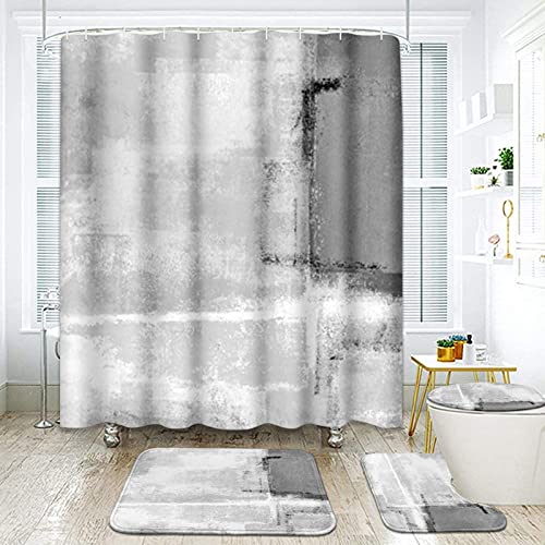 ArtSocket 4 Pcs Shower Curtain Set Grey Abstract Painting Black White with Non-Slip Rugs Toilet Lid Cover and Bath Mat Bathroom Decor Set 72" x 72"