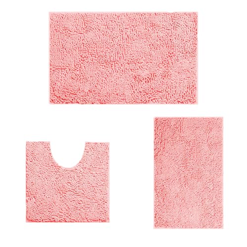 COMPOLICY PLACEROOM Bathroom Mat Set of 3, Bath and Toilet Mat Set,Ultra Soft Chenille Bath Mat Non Slip,Bath Mat Sets 3 Piece Washable,Super-Absorbent Bath(Pink bath set)