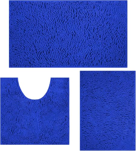 COMPOLICY PLACEROOM Bathroom Mat Set of 3, Bath and Toilet Mat Set,Ultra Soft Chenille Bath Mat Non Slip,Bath Mat Sets 3 Piece Washable,Super-Absorbent Bath(Royal Blue bath set)