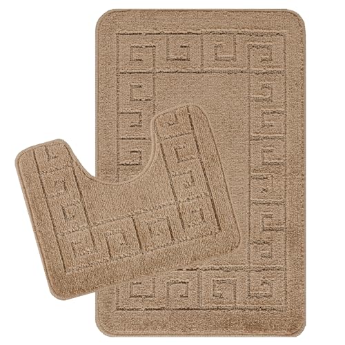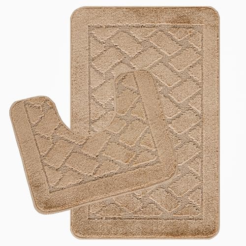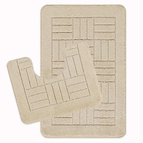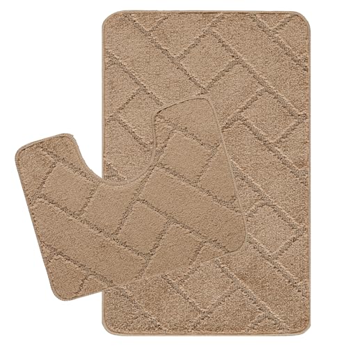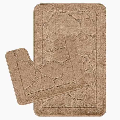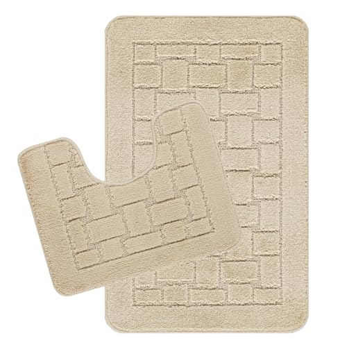 Livabliss Bath Mat Set - Bathroom Mats Sets 2 Piece, Washable Non Slip Bath & Toilet Mat Set - Bathroom Accessories with Absorbent Bathmat Rug, Shower & Co-ordinating Pedestal Carpet, Beige