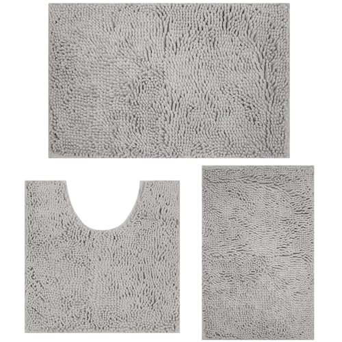 MEGAROOM Non Slip Chenille Bath Mat Sets 3 Piece - Soft and Anti Mould Bath Mats for Safety and Comfort - Water Absorbent and Quick Drying - Bathroom Carpet Set with U-Shaped Toilet Mat(Light Gray)