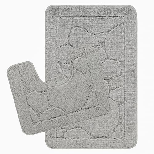 Livabliss Bath Mat Set - Bathroom Mats Sets 2 Piece, Washable Non Slip Bath & Toilet Mat Set - Bathroom Accessories with Absorbent Bathmat Rug, Shower & Co-ordinating Pedestal Carpet, Grey