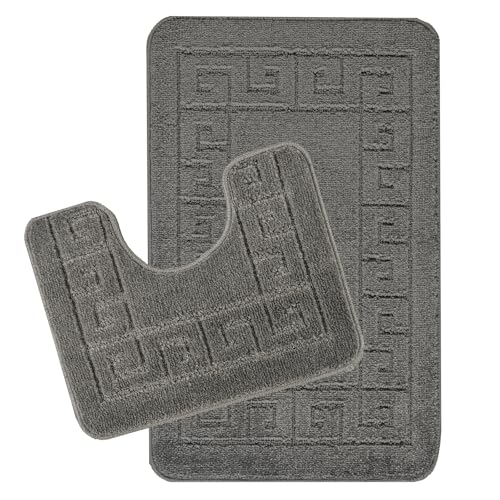 Ambience Products Greek Key Pattern Bath Mats 2 Piece Sets Non Slip Bathroom Mat, Soft Washable Rug Quick Dry Water Absorbent Bathroom Shower Mat & Pedestal Set (Charcoal)