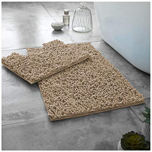 Livabliss Bath Mat Set - Bathroom Mats Sets 2 Piece, Washable Non Slip Bath and Toilet Mat Set - Bathroom Accessories with Absorbent Bathmat Rug, Shower and Co-ordinating Pedestal Carpet, Beige