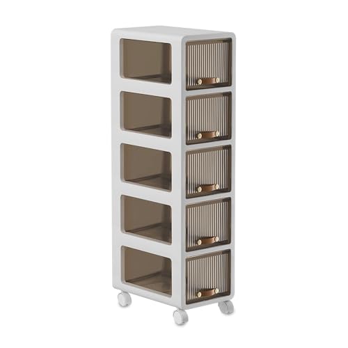 Narrow Bathroom Storage Cabinet - 5-Tier Tall Slim Organiser with Transparent Doors & Wheels | Space-Efficient Floor Cabinet for Small Homes | Rolling Storage Cart for Toiletries & Linens