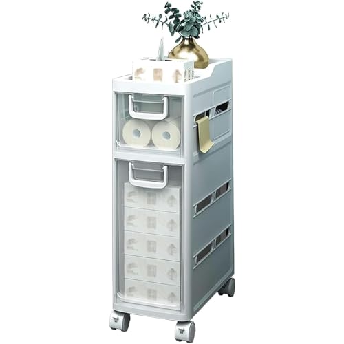HOLMZCED Narrow Bathroom Storage Cabinet with Toilet Paper Holder, 4 Tiers Free Standing Storage Drawers with 4 Wheels Plastic Slim Floor Cabinet Organizer for Living Room