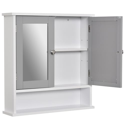 kleankin Mirror Cabinet Wall Mounted with Double Mirrored Doors, Hanging Cabinet with Cupboard and Shelf, Bathroom Wall Storage Organiser, Grey