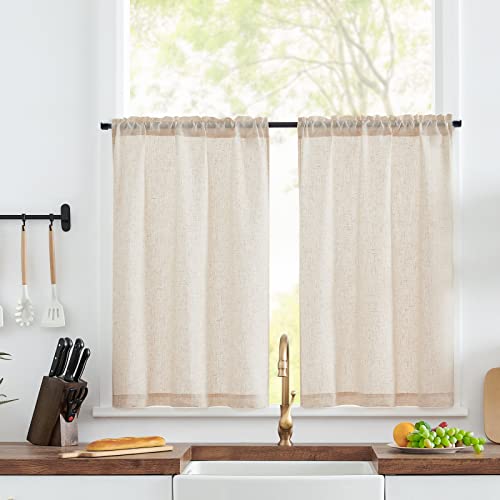TOPICK Linen Optics Beige Kitchen Curtains 24 Inch Drop Small Cafe Curtains Light Filtering Curtain Tiers for Bathroom Sink Cupboard Rod Pocket 2 Panels
