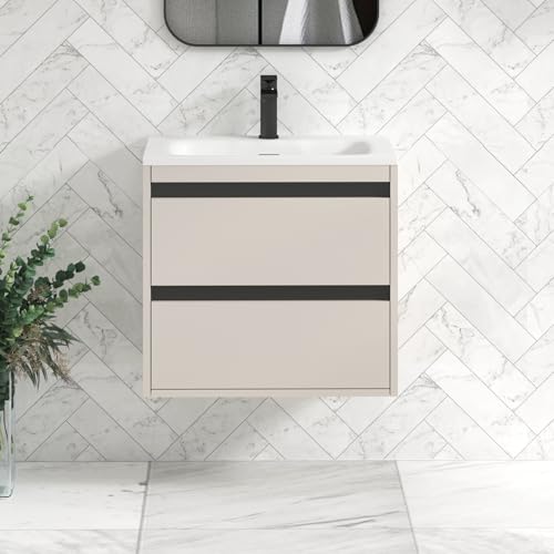 Orion 600mm Beige Wall Hung Vanity Unit 2 Door with Matte Stone Basin & Black Strip Modern Bathroom Under Sink Cabinet Storage Unit