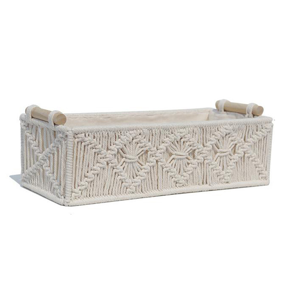 Boho Decor Baskets for Nursery and Bathroom, Handmade Decorative Storage Boxes with Cotton Linen Lining Macrame Storage Baskets, Wood Handles Metal Wi
