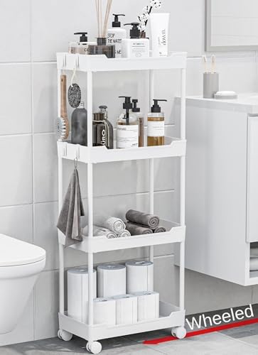 4 Tier Bathroom Trolley on Wheels, 360°Slim Rolling Storage Cart with Hooks Handles Lockable Wheels, Space Saving Multi-functional Utility Cart Mobile Storage Shelving Organizer Make Up Rack, White