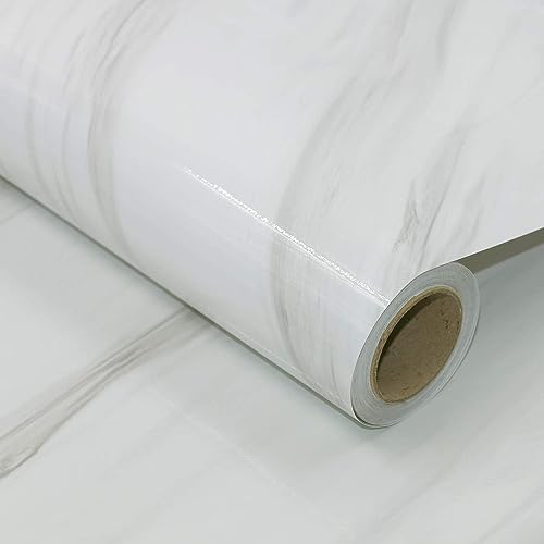 TOTIO White Marble Self Adhesive Wallpaper Shiny Thicken Off-White Granite Look Furniture Sticker 16x354inch Marble Vinyl Wrap Waterproof Wall Sticker for Bathroom Kitchen Worktop Covering