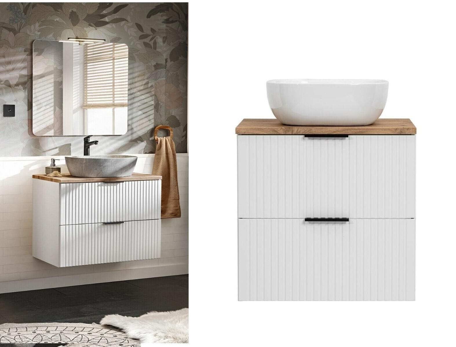 White Vanity Unit Fluted Wall Hung Bathroom Drawers Oak Worktop Sink Basin Adel