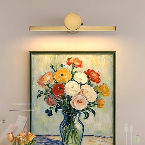 LED Wall Light Rechargeable Battery Picture Light with Remote Control Dimmable Bathroom Mirror Wall Lamp 270° Rotatable Wall Sconces for Gallery Portrait Artwork Living Room