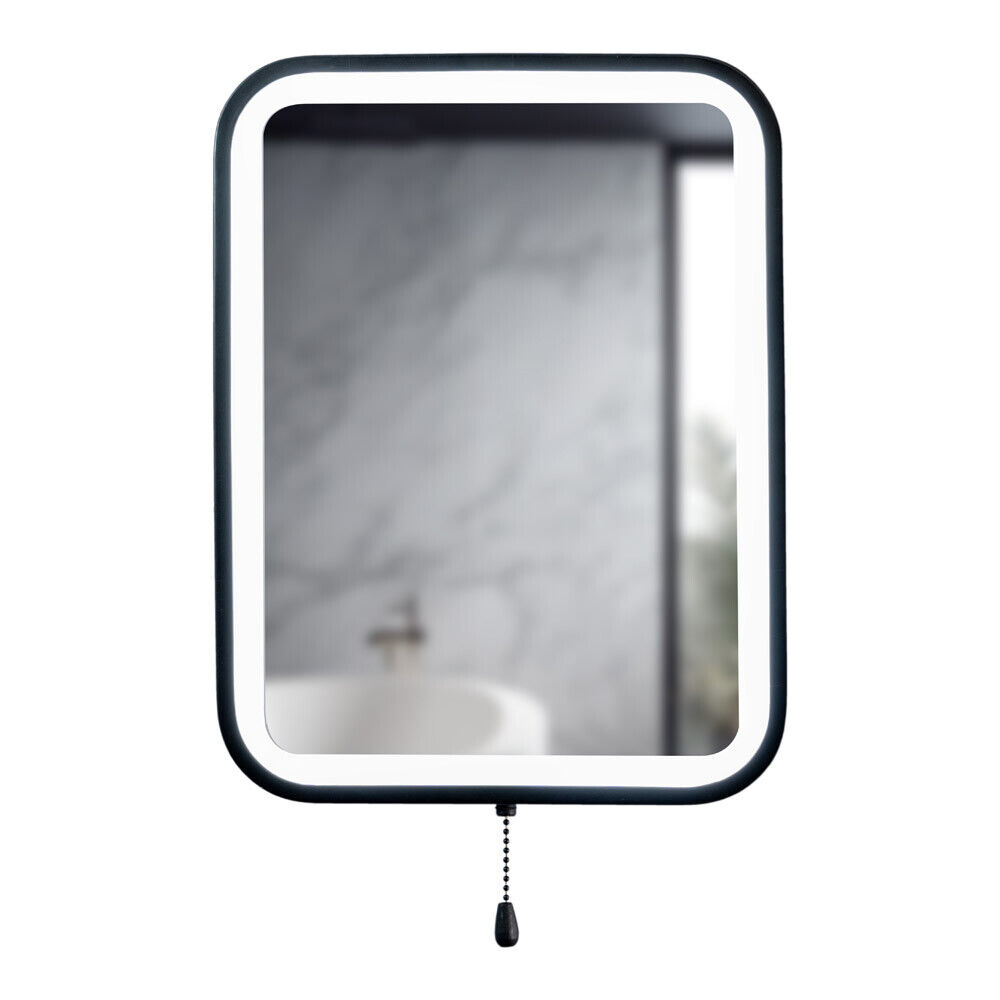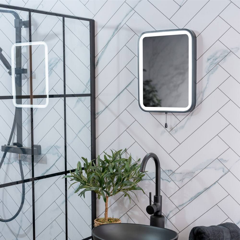 Matt Black Bathroom Mirror Rectangle Battery Operated Pull Switch Integrated LED
