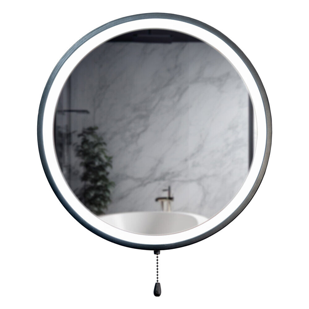Matt Black Bathroom Mirror Round Battery Operated Pull Switch Integrated LED