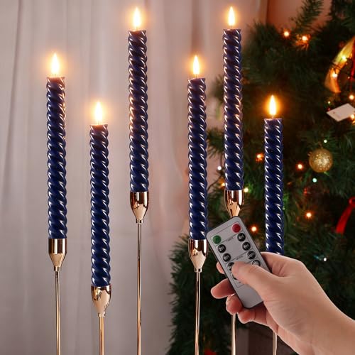 Eywamage Navy Blue Spiral Flameless Taper Candles with Remote, Flickering Battery LED Wax Candle Sticks Set of 6