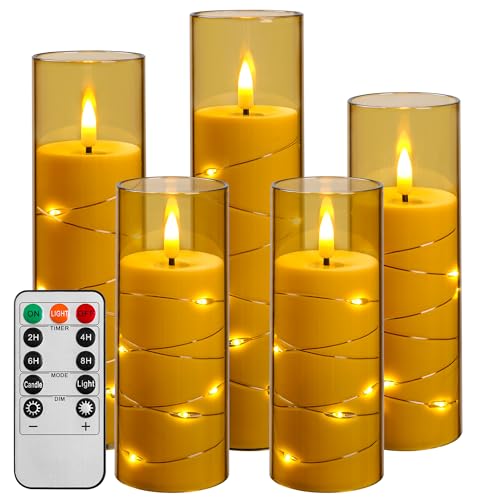 Da by Candles Lights with String Lights, Battery OPowered Candle with Remote Control and 24-Hour Timer, Flickering Flameless Candle for Christmas Decoration, Home Decoration(Grey, Set of 5)