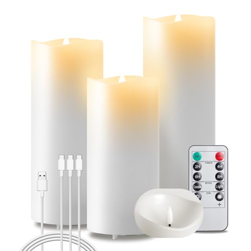 Glowtink 3 Pack Rechargeable Flameless Candles with USB Cable, Real Wax LED Candles with Remote Timer, Battery Candle Flickering for Home Christmas Decorations, Ivory, H 6" 7" 8"