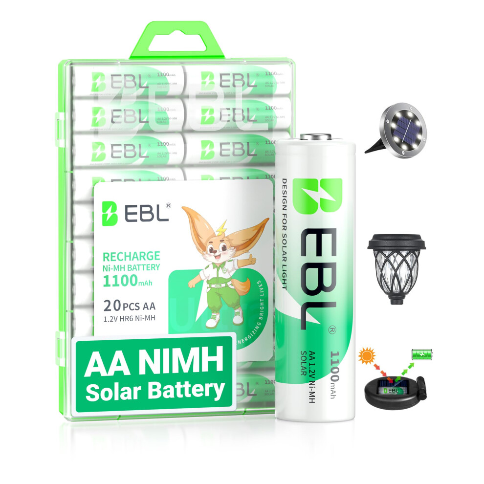 EBL 1100mAh Rechargeable Battery AA Solar Battery for Garden Lights 20 Pack, 1.2V NiMH AA Rechargeable Batteries for Solar Lights, String Lights, Pre