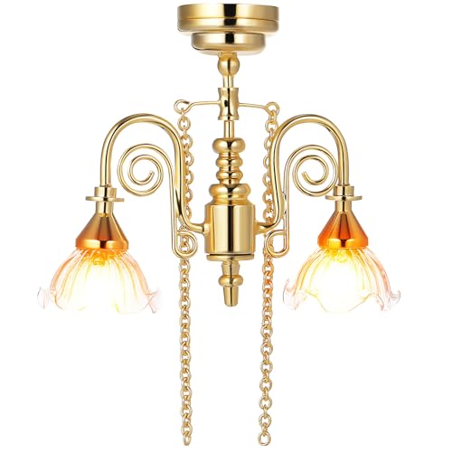 Joygoodta Realistic Dollhouse Lights, 1:12 Miniature LED Dollhouse Lighting, Battery Operated Vintage Hanging Ceiling Lamp for DIY Pretend Play Dolls House Decor, Gold
