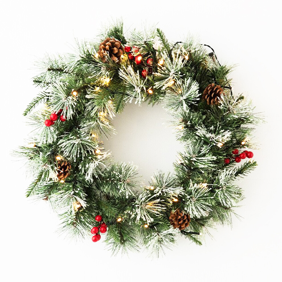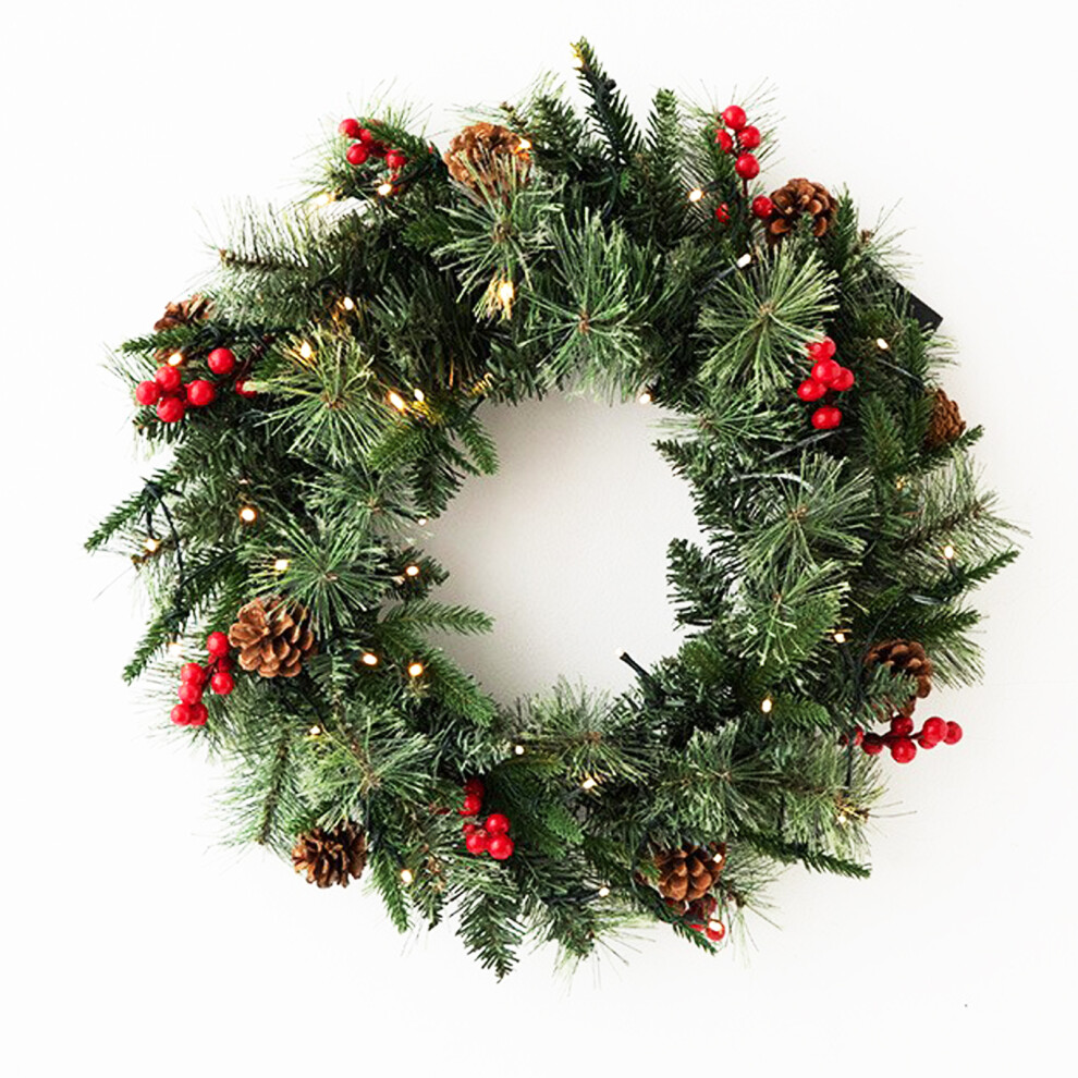 Pinecone Berry Christmas Wreath, 24 Inch Pre Lit Wreath with LED Battery Timer Lights, Fire Resistant Holiday Decor for Indoors Outdoors