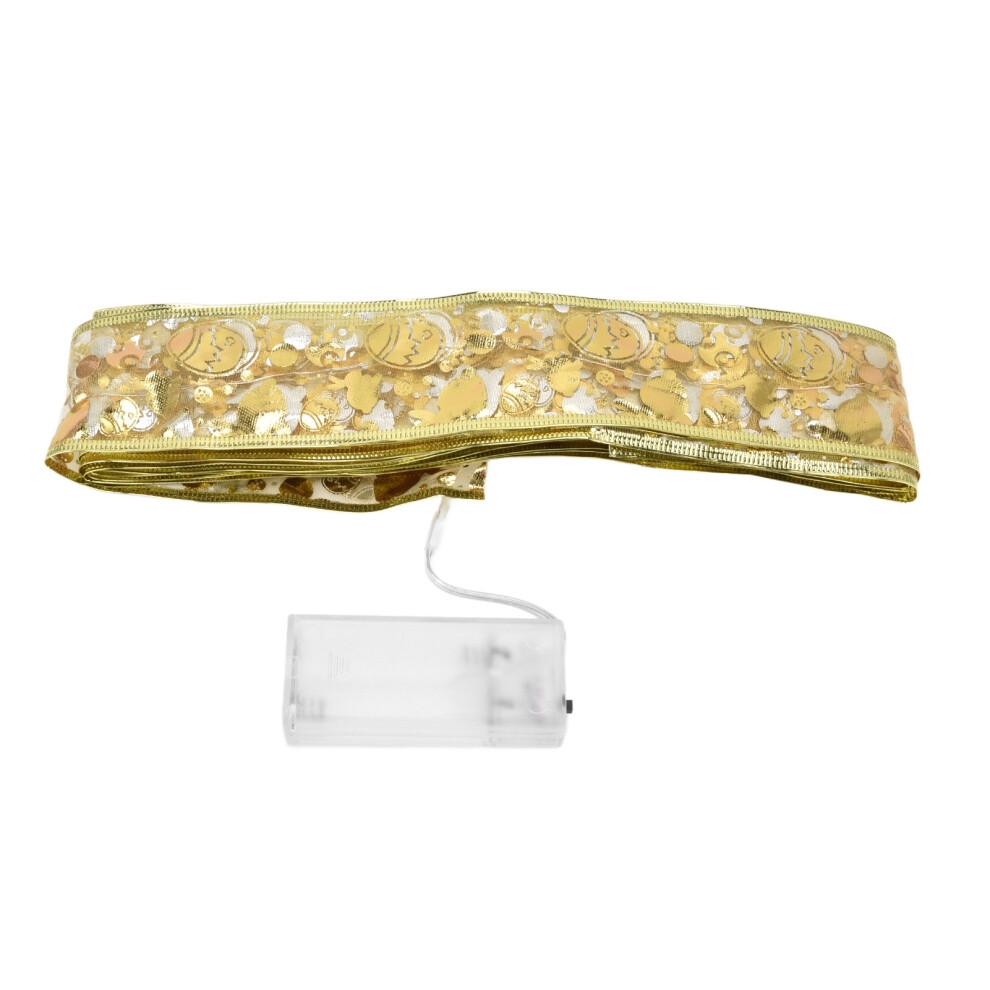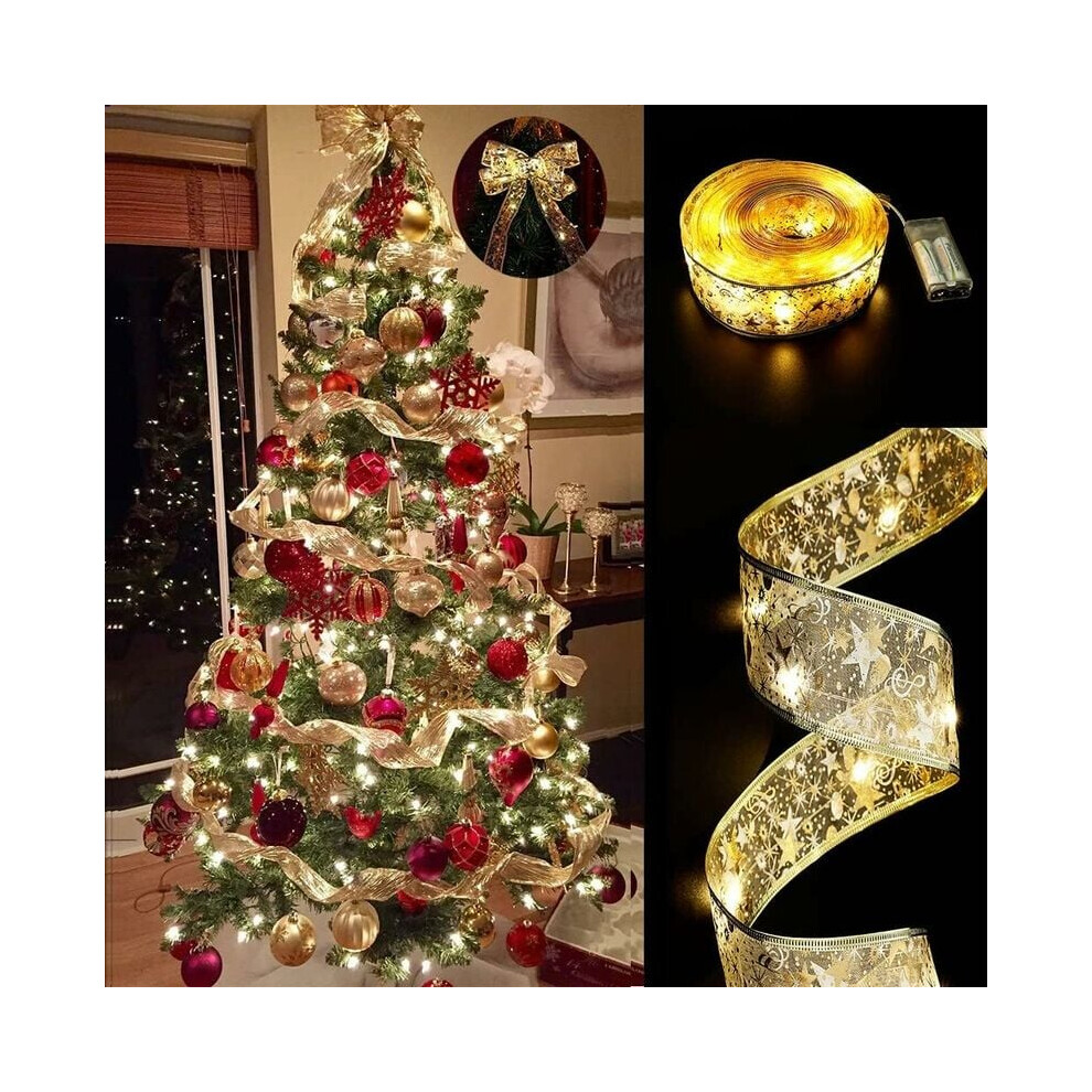 Gold Glitter Ribbon, Christmas Tree Decoration with Warm White LED Lights, Battery Operated Fairy Lights for Indoors and Outdoors