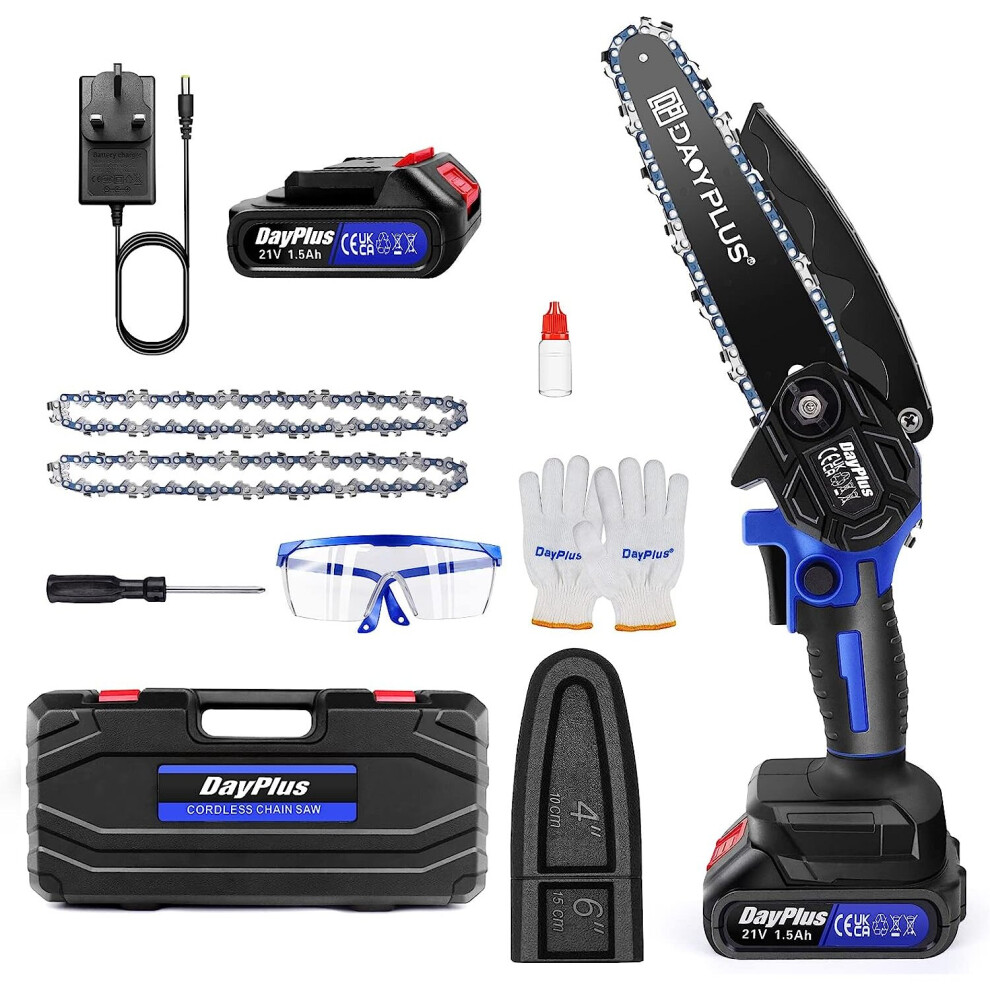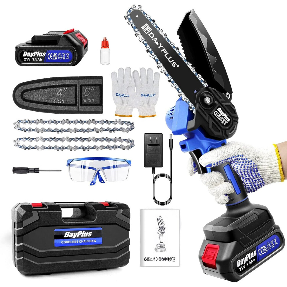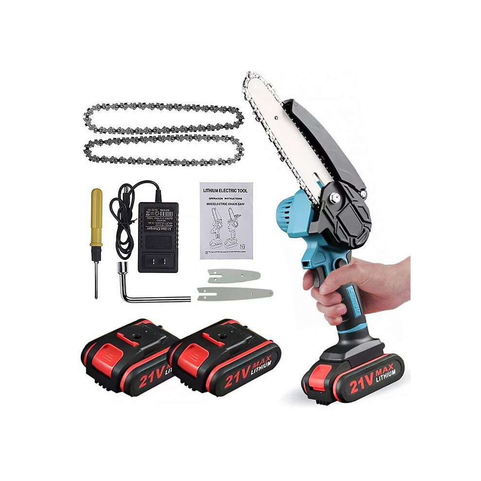 (blue) 2 Battery 3000W Mini Cordless Chainsaw 4/6'' One-Hand Electric Saw Wood Cutter