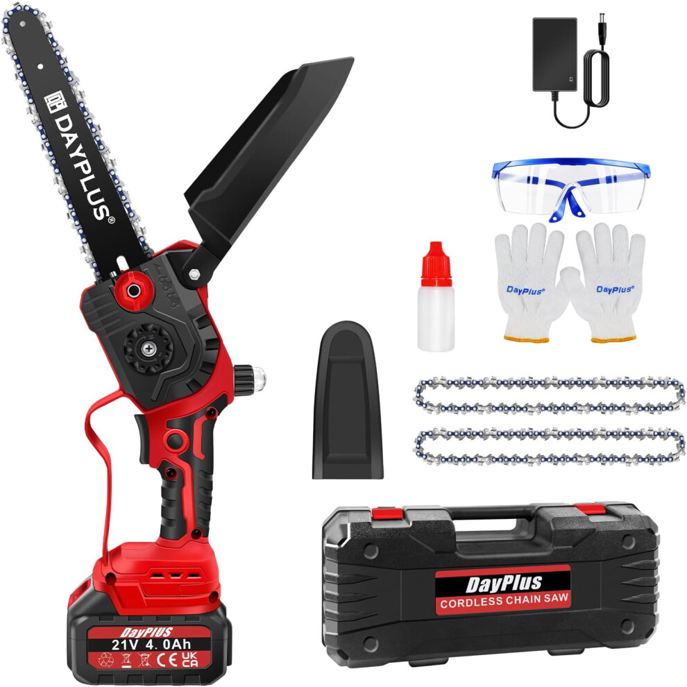 Portable Battery-Powered Mini Chainsaw, 4 Inch Cutting Diameter, Wide Application for Gardening and Wood Cutting, Includes Safety Splash Guard,