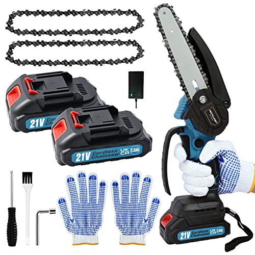 Mini Chainsaw 6 inch Cordless, 21V/2Ah Battery Powered Chain Saw for Branch Pruning with 2 Battery, Portable Electric Handheld Small Chainsaw w/Security Lock, for Wood Cutting Tree Trimming