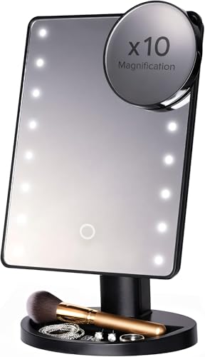 H&S Makeup Mirror with Lights - Light Up Vanity Mirror for Dressing Table Bathroom Desk - Battery Operated with LED Lights - Includes Detachable 10x Magnifying Mirror - Black