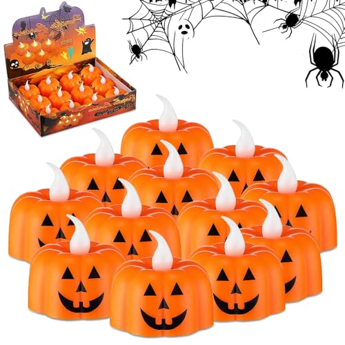 Aongray 12PCS Pumpkin Tealights Candles Flameless Halloween Party Decorations, Flickering Candle Lights Battery Operated LED Tea Lights - 3D Orange Lanterns Candles for Halloween Parties