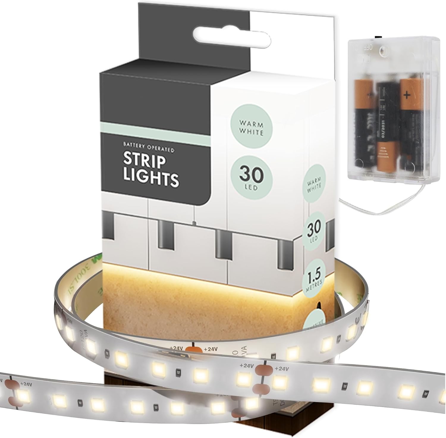 1.5m AA Battery Operated Indoor Warm White LED Strip Lights, Ideal for Under Shelf Lighting, Cupboards, Wardrobes, Behind TV, Above Mirror, Cars, Motorhomes, Caravans, Lounge, Kids Bedroom
