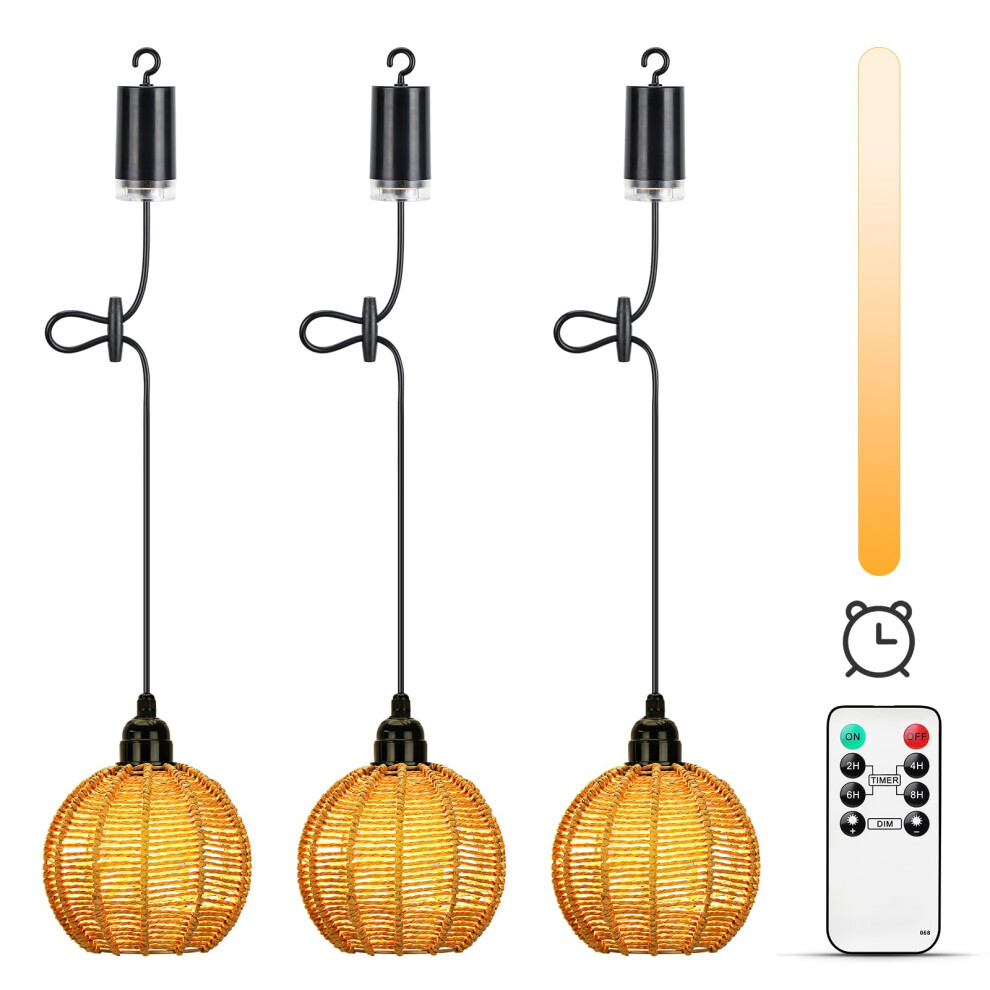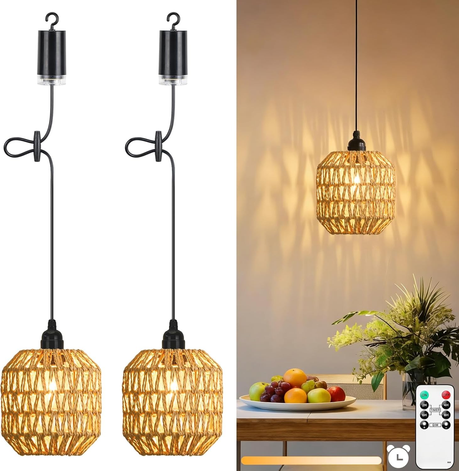 Frewurwer 2pcs Battery Power Pendant Light Woven Rattan Pendant Light for Gazebo, Pergola, Porch, Indoor and Outdoor Decor