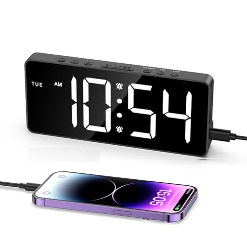 OQIMAX Digital Alarm Clock, Large LED Display Bedside Clock with 5 Levels Brightness Adjustment, USB/Battery Powered Alarm Clock with Date, 3 Levels of Volume, 4 Alarm Modes,12/24H, DST Function