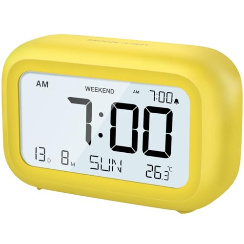 DOOMAY Digital Alarm Clock Bedside - Battery Powered Clock with LCD Display Volume Adjustable Snooze and Weekend Mode for Bedroom Office Desk Travel (Yellow)