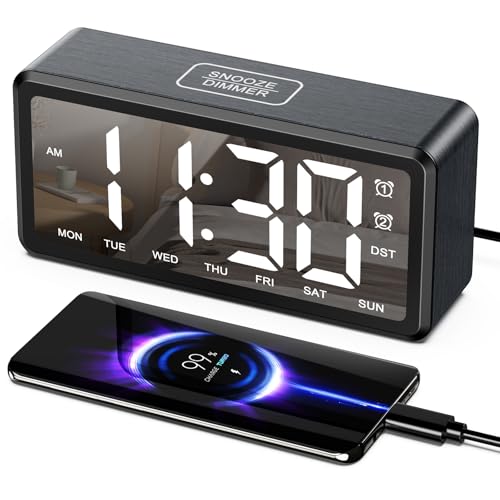 Digital Alarm Clock, Large Display Bedside LED Electronic Digital Clock Silent No Ticking, USB Mains Powered/Battery Powered Bedroom Alarm Clock with Temperature Display, Adjustable Brightness,12/24H