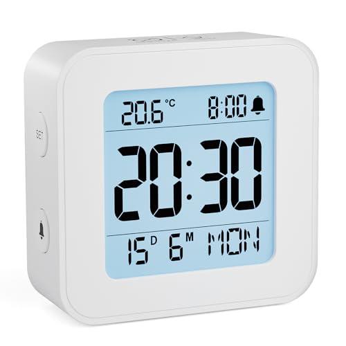 LATEC Alarm Clock Bedside Battery Powered LCD Digital with Date & Day, Snooze, Temperature, 12/24H, Backlight, 3 Volumes, Silent Travel Small for Heavy Sleepers Included Battery White