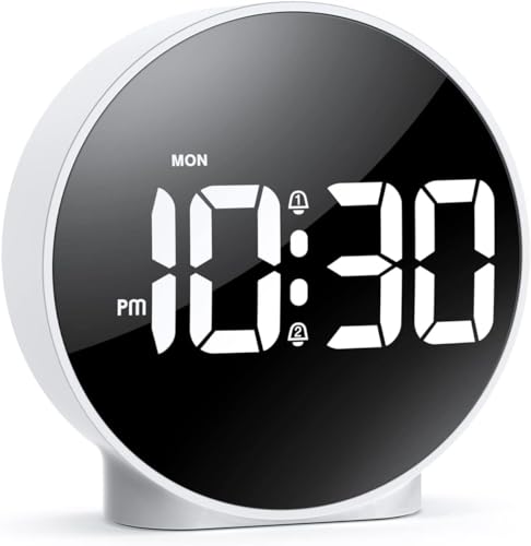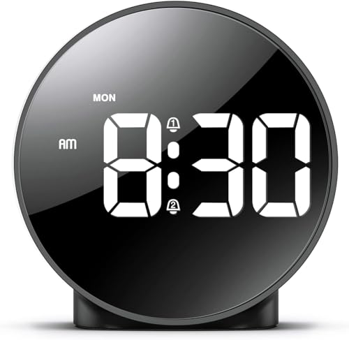 OQIMAX Mirror Digital Alarm Clock, Large LED Display Wooden-Style Alarm Clocks, Alarm Clock with Adjustable Brightness & Volume, Dual Alarm, USB/Battery Powered Desk Clock with 12/24H, DST, Snooze
