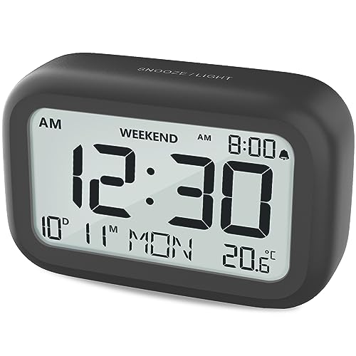 Plumeet Digital Alarm Clock Travel Clock with Snooze and Nightlight - Easy to Set Simple Bedside Alarm Clocks for Kids - Ascending Sound - Battery Powered (Black)