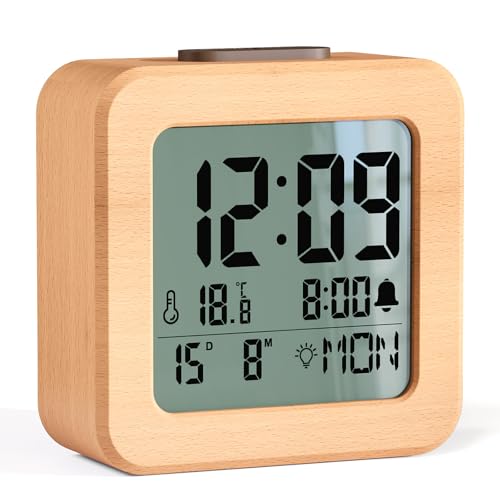 HERMIC Alarm Clock, Wooden Digital Alarm Clock Bedside Battery Powered with Temperature, Date, LCD Backlit, Light Sensor, Snooze, 12/24H, Loud Clock for Heavy Sleepers【3 AAA Battery Included】