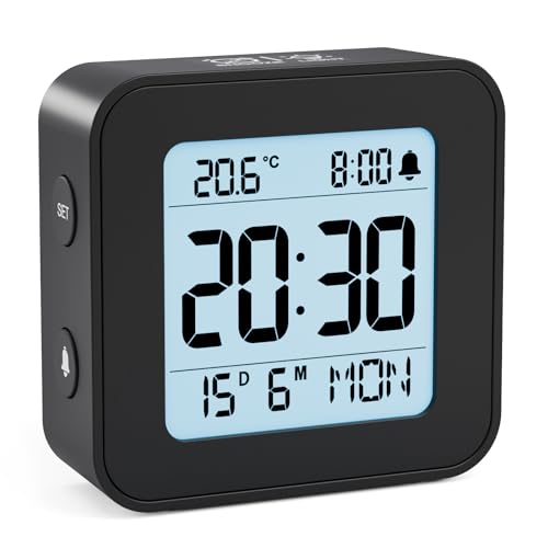 LATEC Alarm Clock Bedside Battery Powered LCD Digital Clock with Date & Day, Snooze, Temperature, 12/24H, Backlight, 3 Volumes, Silent Travel Small Clock for Heavy Sleepers Included Battery Black