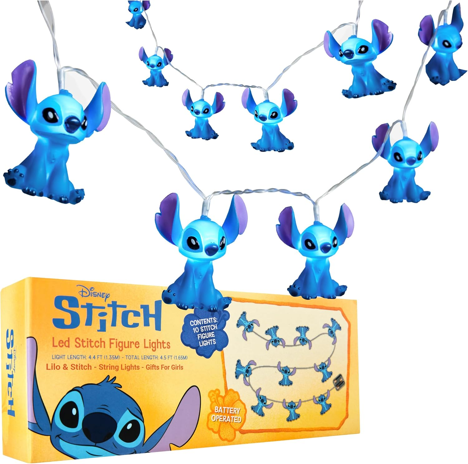 Disney Stitch 3D LED String Lights, 10 Pcs Battery-Powered Fairy Lights Kids Tee
