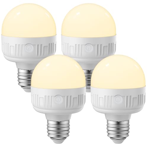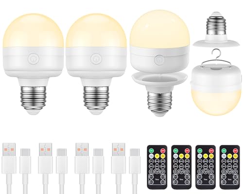 LGMCF Rechargeable Light Bulb, E27 Dimmable Bulb with Hidden Hook and Remote Control, 10W Battery Powered Light Bulb with Magnetic Base Detachable for Non Hardwired Lamps, Camping, Emergency, 4 Pack