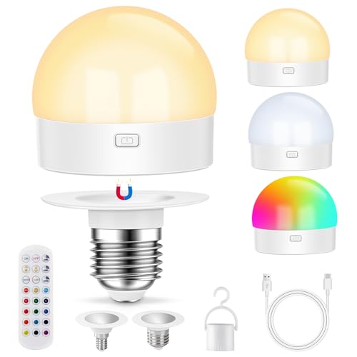 USB Rechargeable Light Bulb with Remote Control, Dimmable Colour Bulbs with Timing, Detachable RGB LED Bulb with E27 & E14 Bases, Battery Powered, 12+3 Color Temperatures, for Non Hardwired Lamps