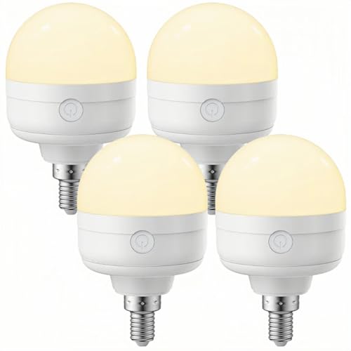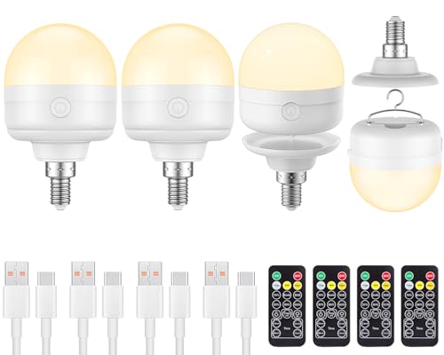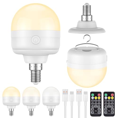 LGMCF Rechargeable Light Bulb, E14 Dimmable Bulb with Hidden Hook and Remote Control, 10W Battery Powered Light Bulb with Magnetic Base Detachable for Non Hardwired Lamps, Camping, Emergency, 4 Pack
